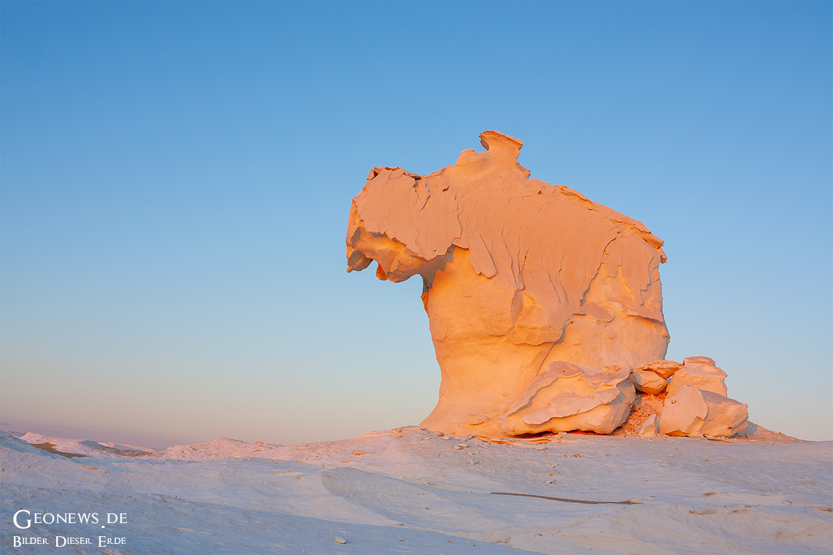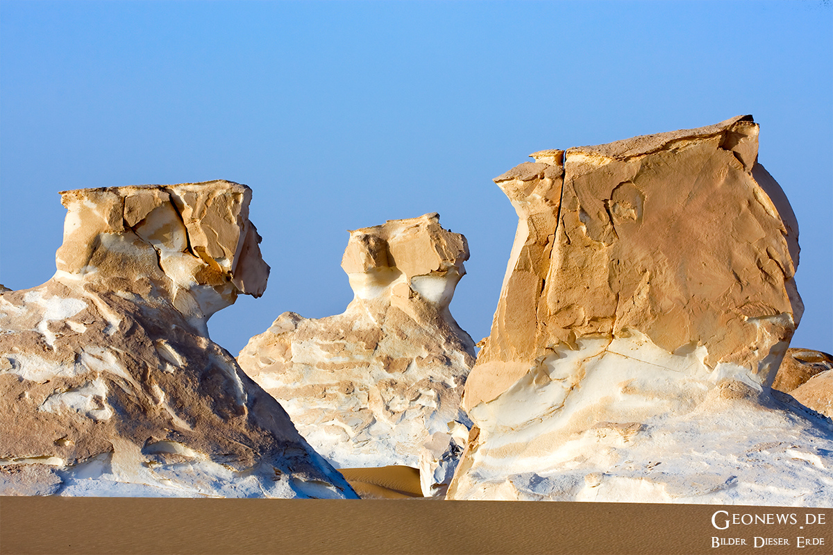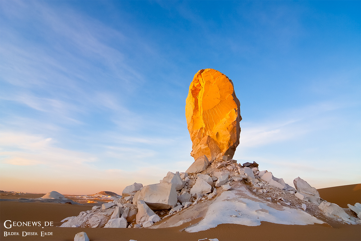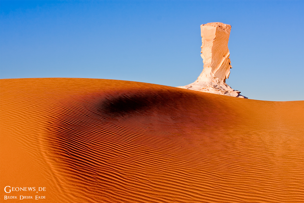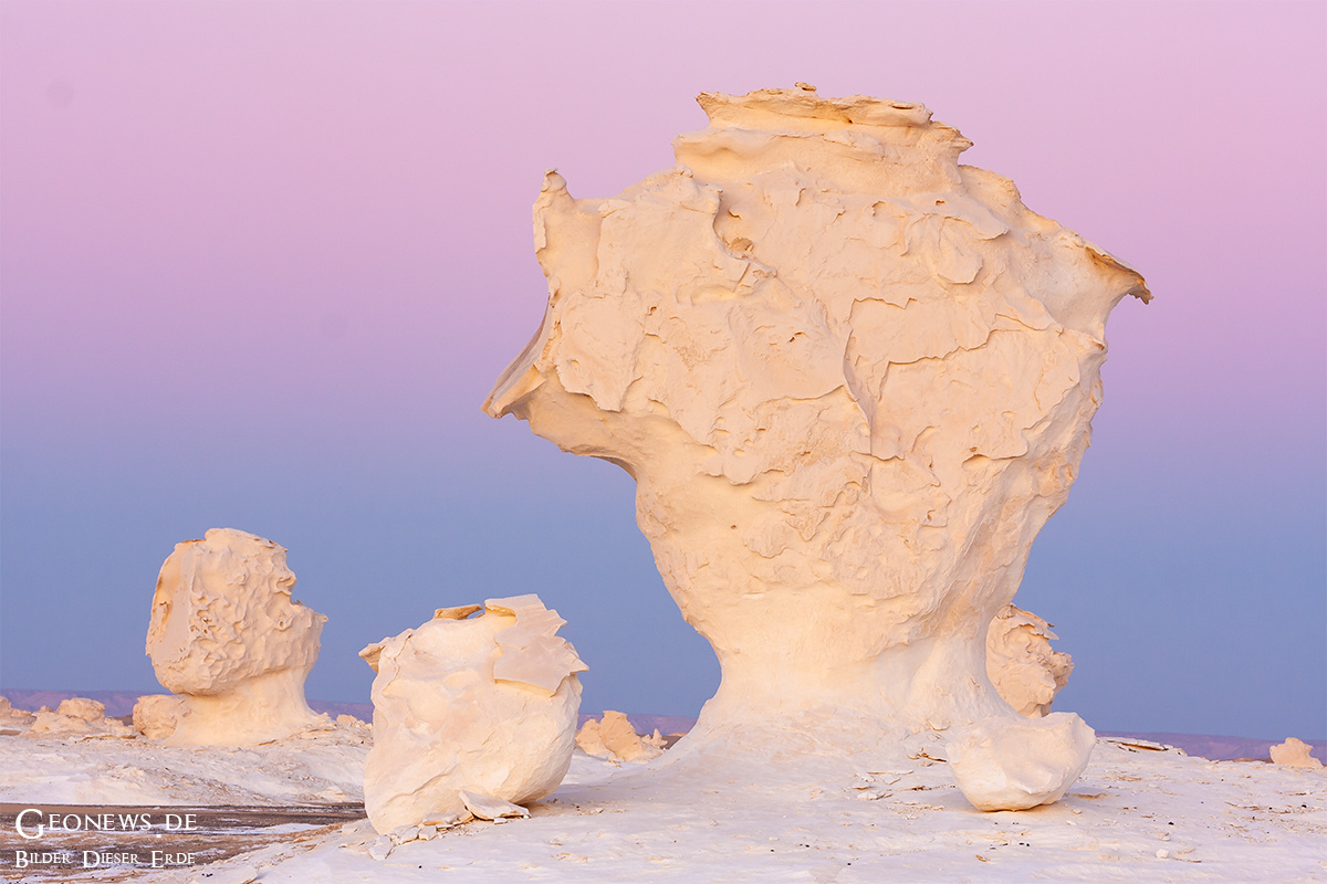 Die Weiße Wüste (el-sahara el-beida) bezeichnet ein ca. 150 km² großes Gebiet zwischen den Oasen Farafra und Bahariya und dem sich in Westen bis zur Oase Siwa erstreckenden großen Sandmeer. Leider werden die dort landschaftsprägenden Gesteinsskulpturen oft als Kalkstein bezeichnet. Die namensgebenden, blendend weißen Gesteine bestehen jedoch aus winzig kleinen Kieselalgen (Diatomen), die hier das einzige Meer bevölkert haben. Das prall mit Leben gefüllte Meer hat sich in eine äußerlich, karge lebensfeindliche Wüste verwandelt.