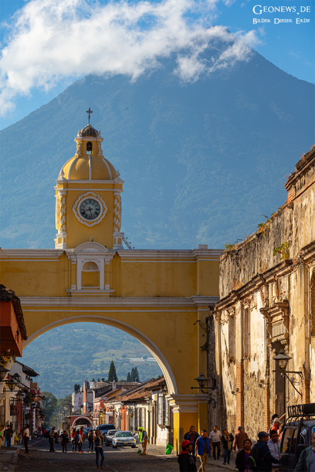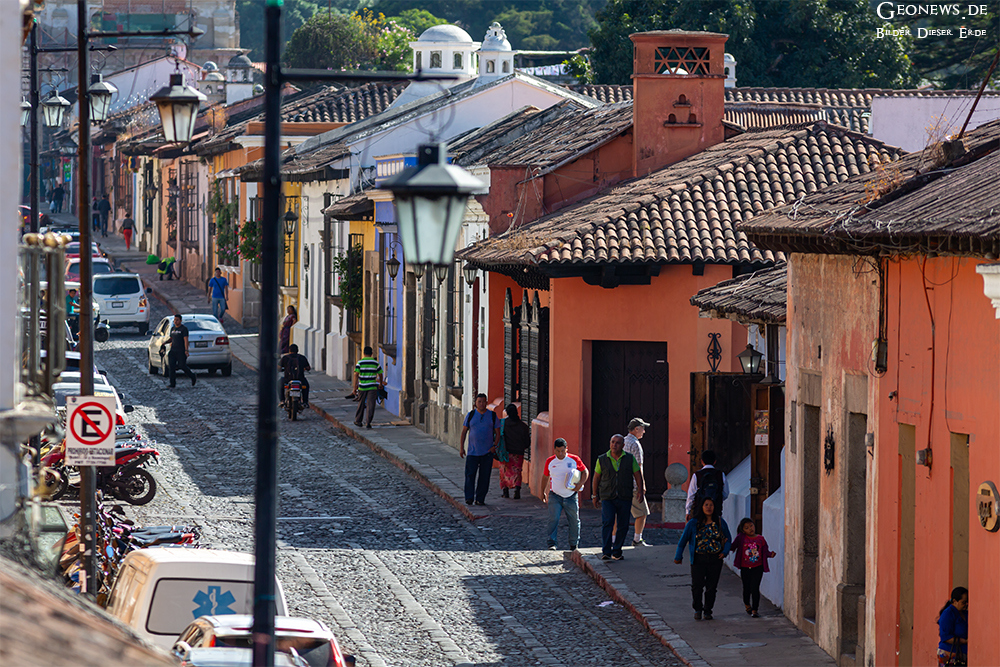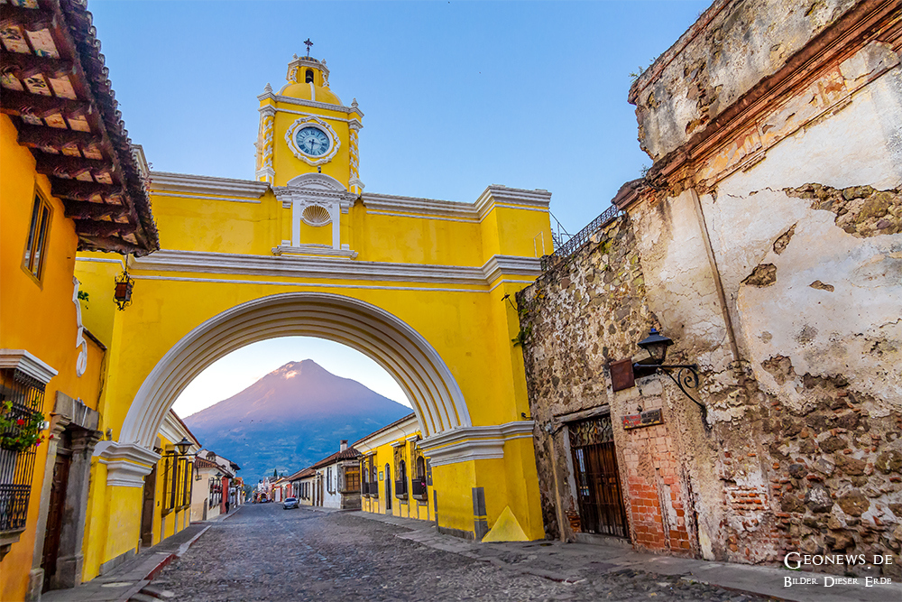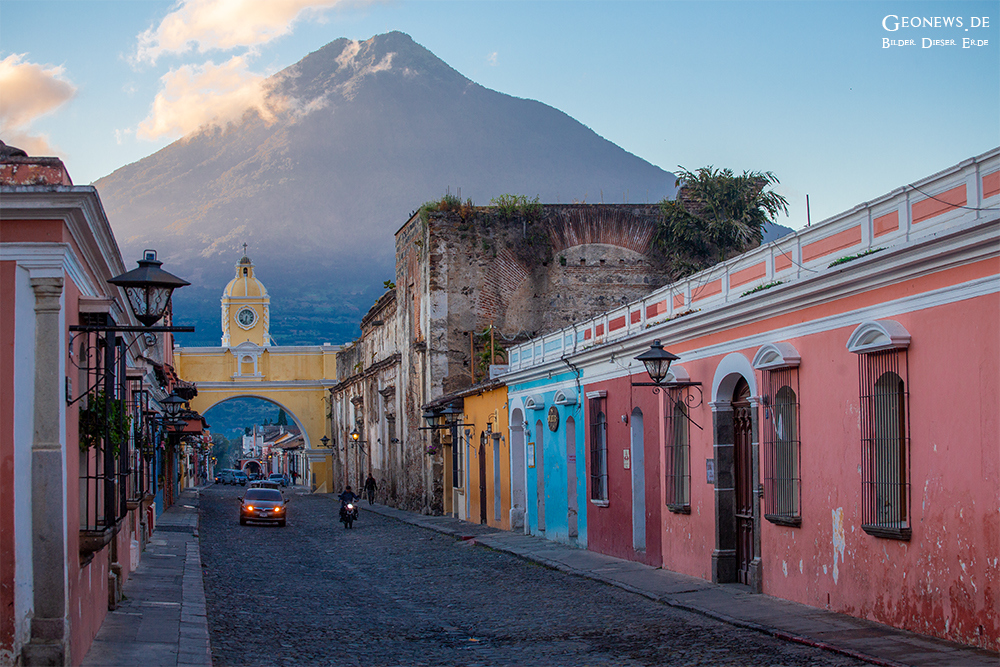 La Antigua Guatemala oder auch kurz Antigua war die koloniale Hauptstadt der Spanier von Zentralamerika, das die heutigen Staaten von Belize, über Costa Rica bis nach Panama umfasste. Die von der UNESCO im Jahr 1979 ins Weltkulturerbe aufgenommen und liegt nur 25 km westlich von der heutigen Hauptstadt von Guatemala. Die Stadt liegt in einem Talkessel auf ca. 1.500 m Seehöhe und ist von drei ca. 3.700 bis 3.900 m hohen Vulkanen, dem Agua, dem Acatenango und dem Fuego eingerahmt. Vor allem der Fuego ist immer noch aktiv und schickt täglich seine Aschewolken in den Himmel.