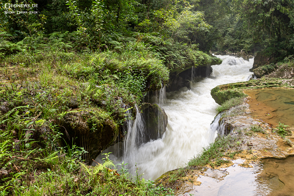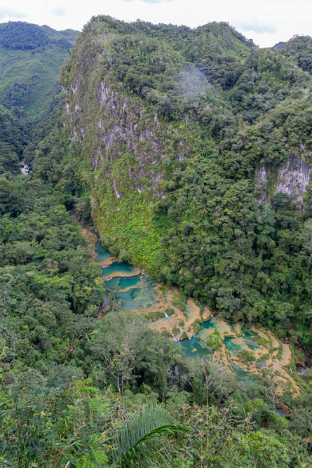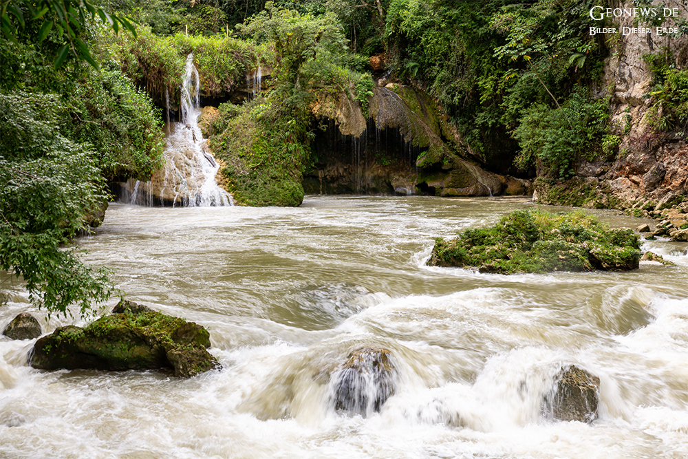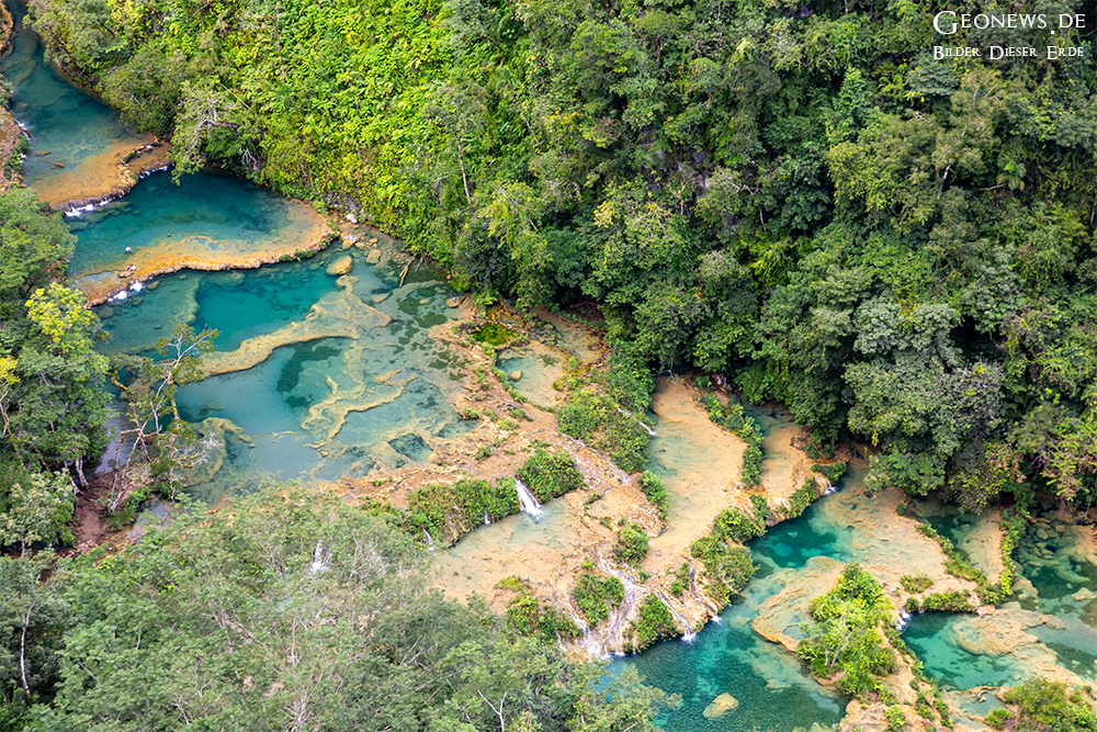 Der Semuc Champey und das gleichnamige, ziemlich abgelegene Naturschutzgebiet liegen ca. 65 km westlich vom Lago de Izabal am Fluss Rio Cahabón, der schließlich am Westende des Lago de Izabal in diesen mündet. Ab dem See wird der Cahabón dann als Rio Dulce bezeichnet. Die Bezeichnung Semuc Champey kommt aus der Maya-Sprache K’iche’ und bedeutet in etwa so viel wie „dort, wo das Wasser verschwindet oder sich versteckt“.