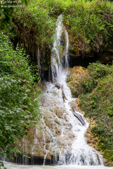 Der Fluss verschwindet auch dort auf eine Strecke von mehreren hundert Meter in einer Karsthöhle unter dem ursprünglichen Flussbett, sodass an der Oberfläche nur die stufenförmige Terrassen aus Travertintuff und mit türkisfarbenen Wasser gefüllte Becken zu sehen sind. Das Wasser in den Becken kommt nur im Hochwasserfall aus dem Fluss. Das Türkis weicht dann sehr schnell einer tosenden, braunen Brühe. Bei Niedrigwasser besteht nur noch ein Wasserzufluss aus kalkhaltigen Quellen im Bereich der dort steil aufragenden Felswände der Schlucht. Die feinverteilten, aus ausgefallenem Kalk bestehenden Schwebstoffe geben dem Wasser dann die typische türkise Farbe.
