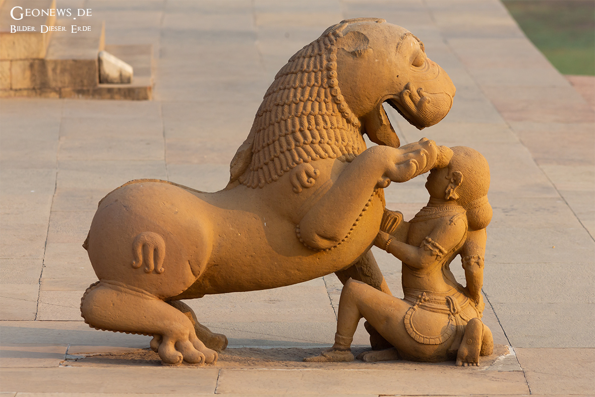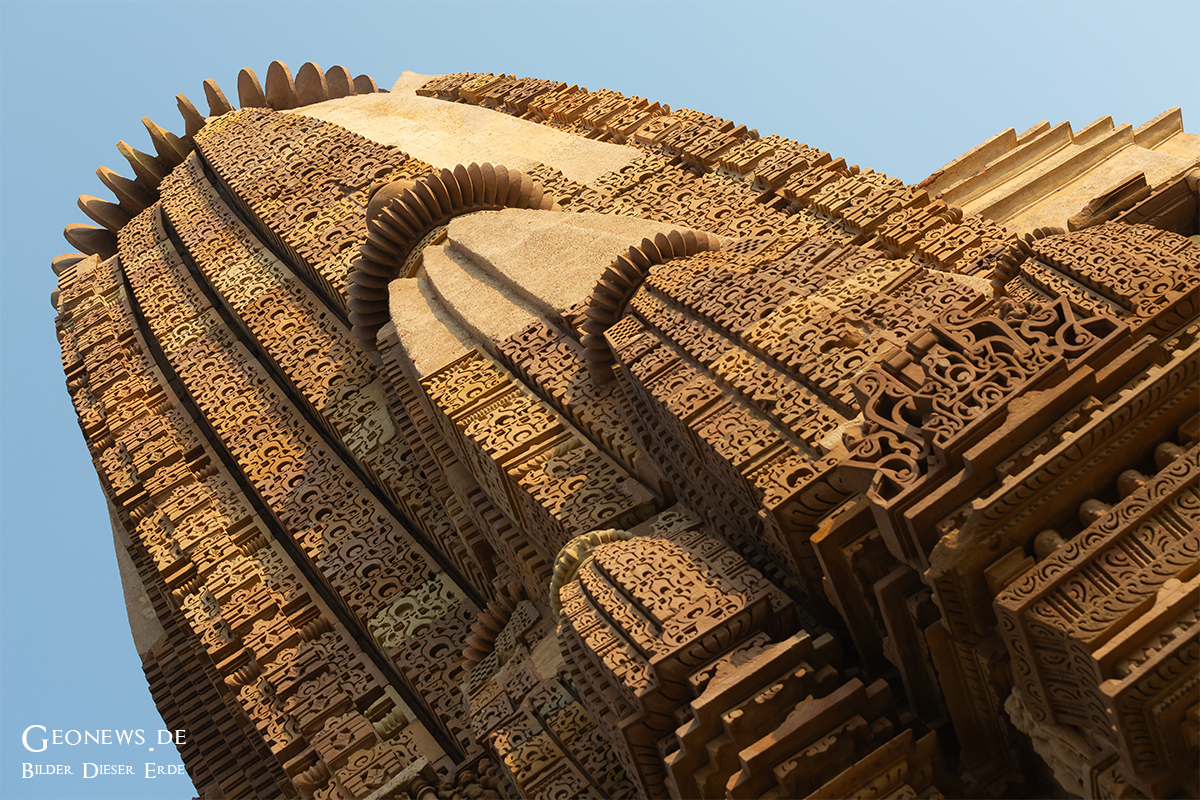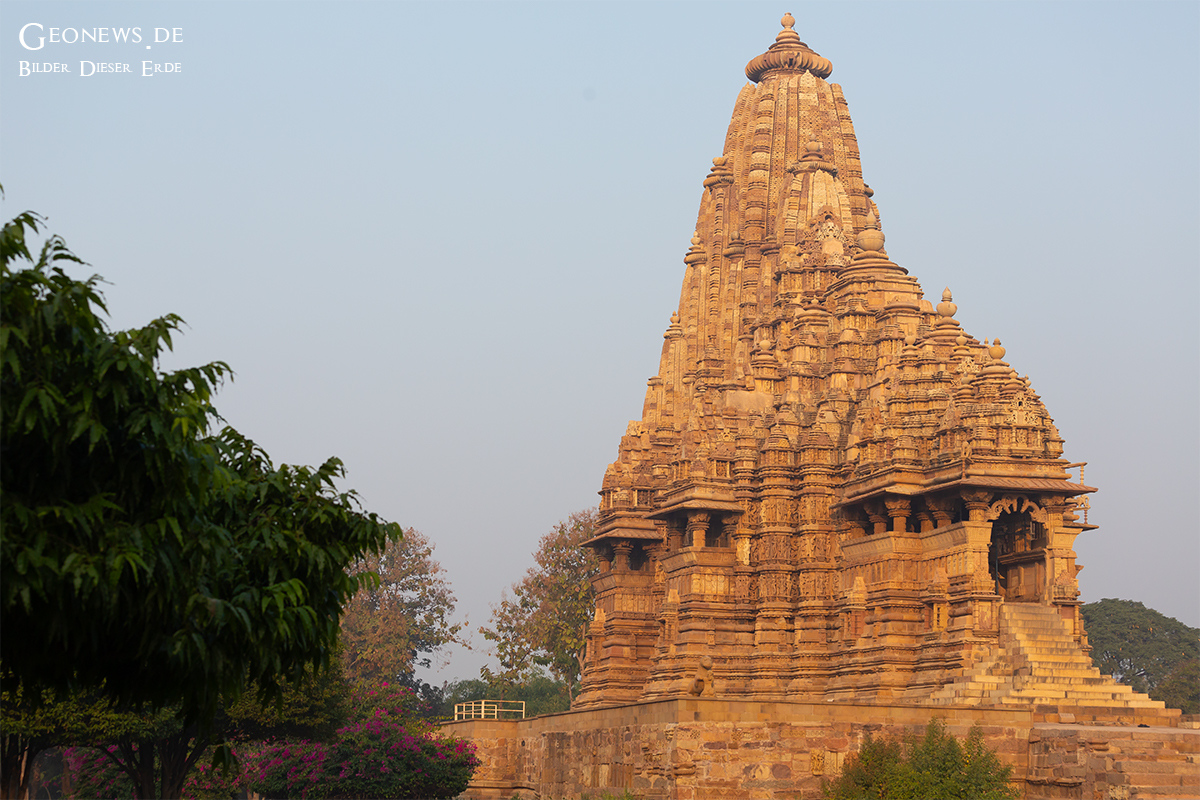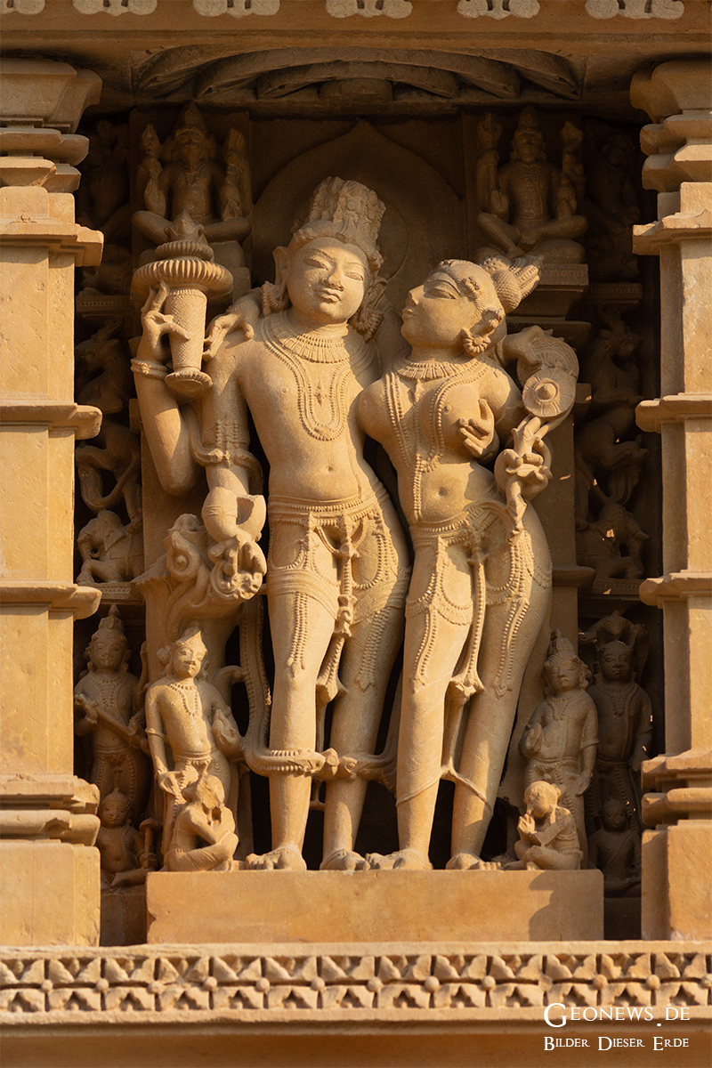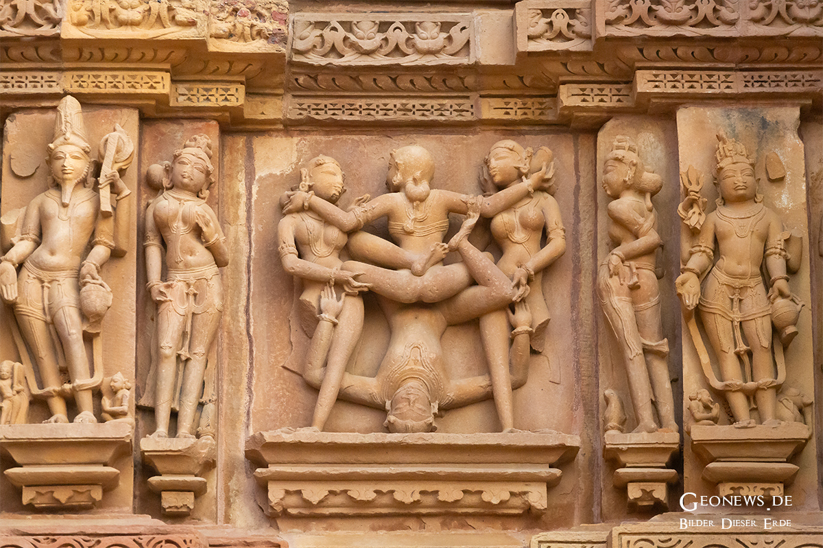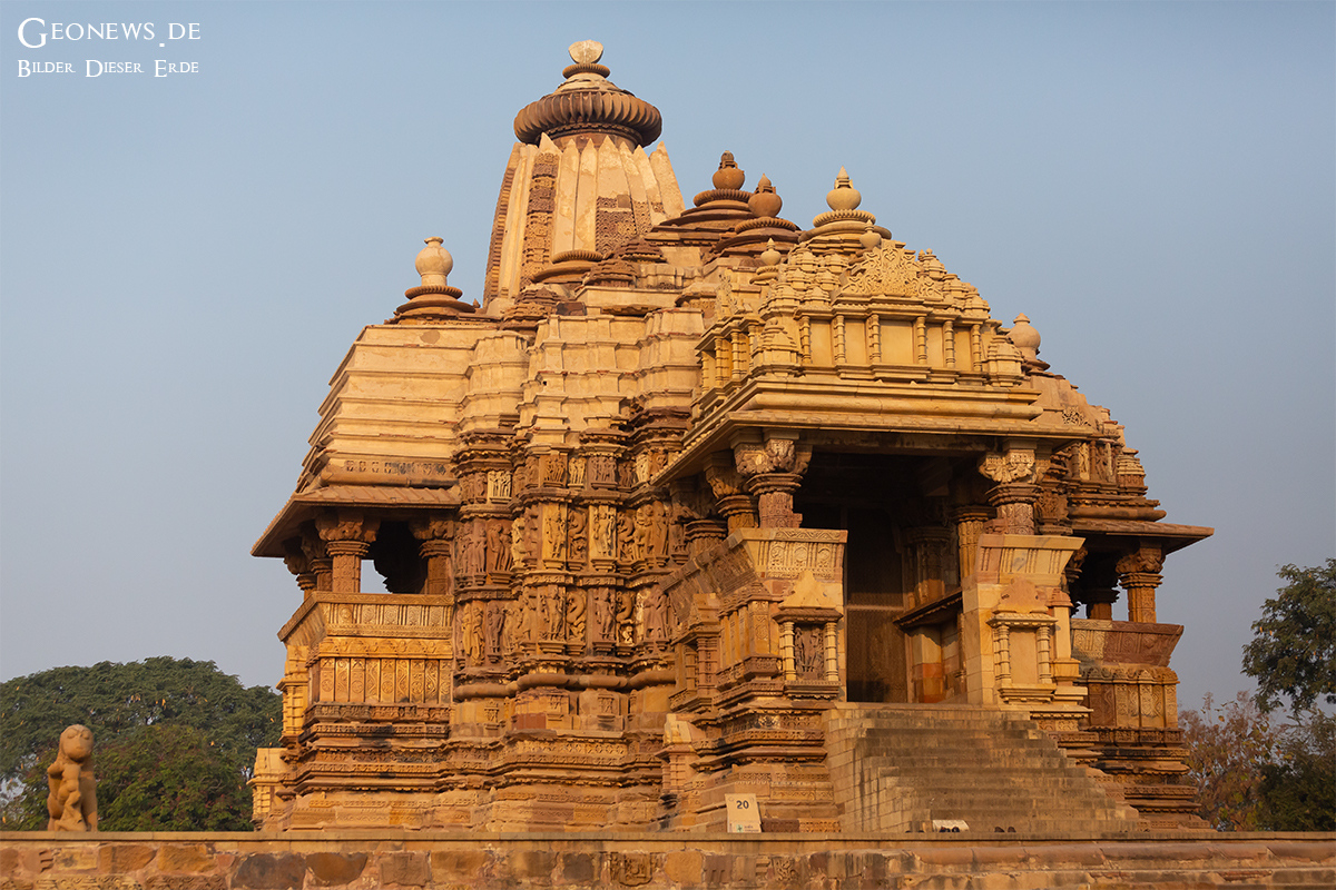 Die Stadt Khajuraho und die gleichnamige Tempelanlage liegen ca. 500 km südöstlich von Delhi im nordöstlichen Teil des Bundesstaates Madhya Pradesh. Die etwa 20 Tempel, die von den 95 einst erbauten Tempelm noch erhalten sind, bieten ein harmonisches Gleichgewicht zwischen Architektur und Bildhauerkunst in Indien. Die Tempel wurden zwischen den Jahren 950 und 1150 wurde von den Herrschern der Chandella-Dynastie erbaut.