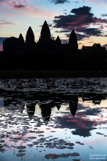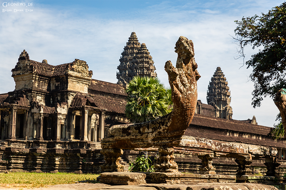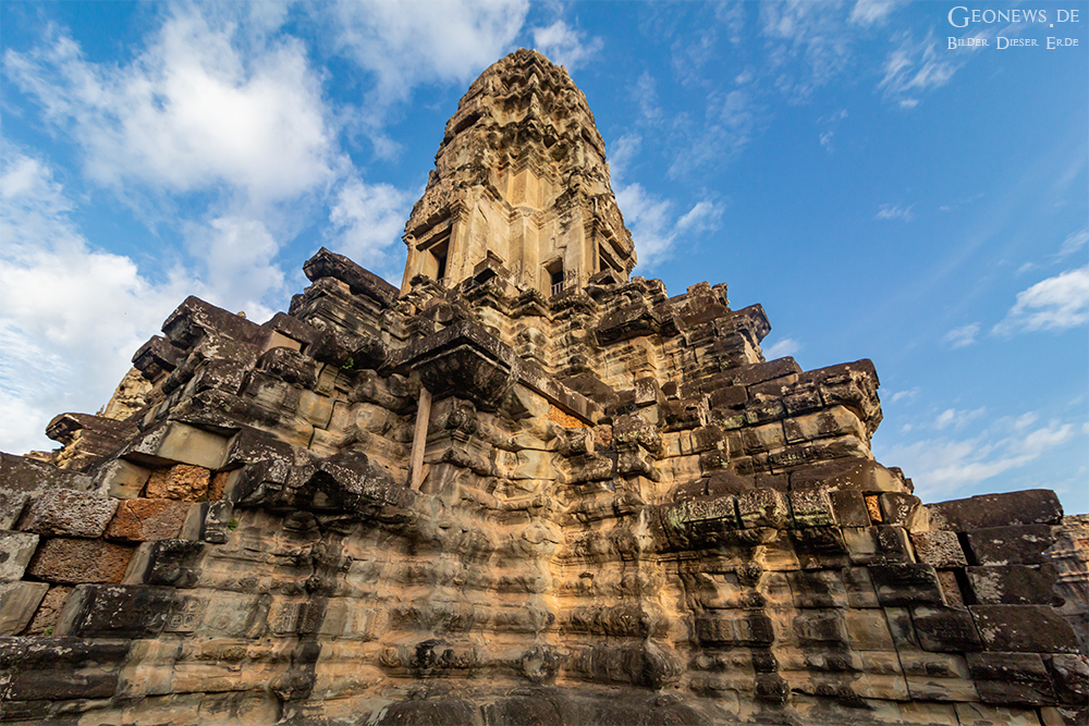 Die Tempelanlage Angkor Wat ist mit ca. 1,5 km² das größte religiöse Gebäude der Welt und somit noch größer als der Petersdom in Rom. Der Khmer-König Suryavarman II. erbaute den Tempelkomplex im 12. Jahrhundert als Staatstempel und eigenes Mausoleum. Der Tempel vereint zwei Grundprinzipien der Khmer-Tempelarchitektur. Dort werden der Tempelberg und die Tempelgalerie dargestellt. Der mittlere der 5 Türme stellt dann den Berg Meru dar.