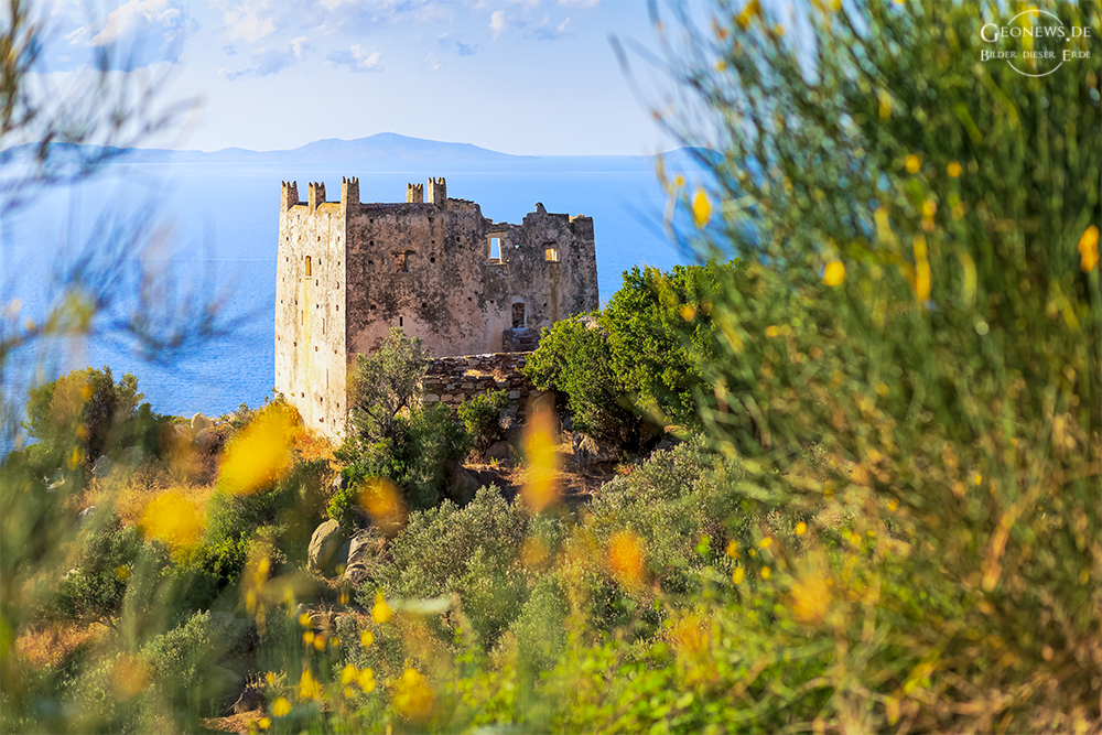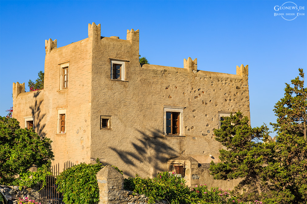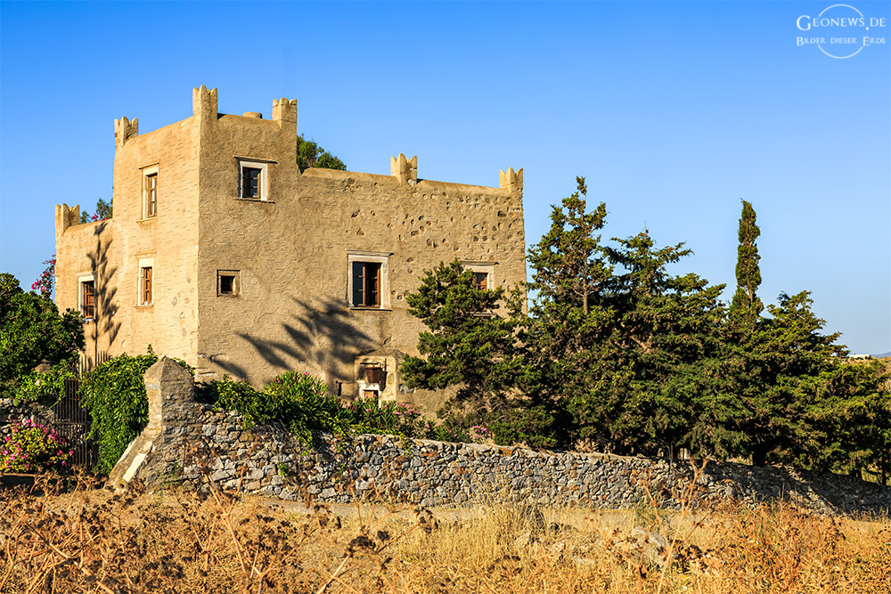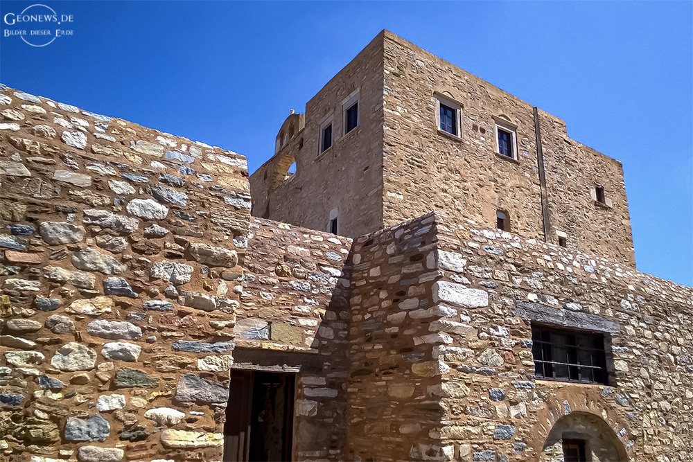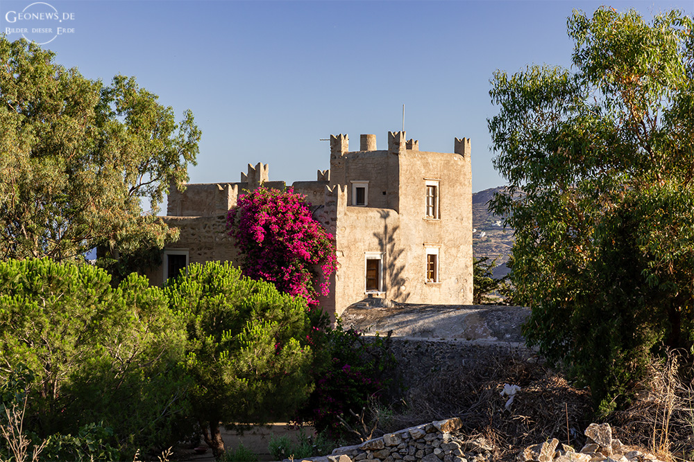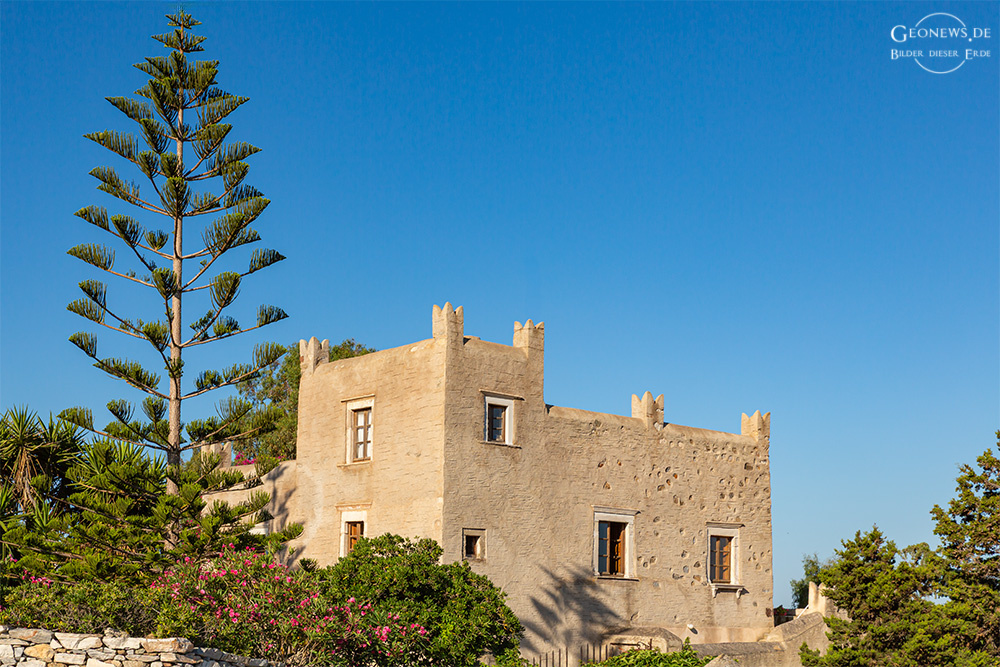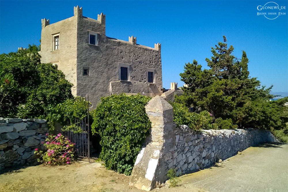 Der Bazeos Tower liegt ca. 15 km von der Chora entfernt, fast direkt an der Hauptstraße von der Chora nach Chalki, am Abzweig Richtung Agiassos. Die Wehranlage stammt aus dem 17. Jahrhundert und gehört zu den typischsten Wehrtürmen auf Naxos auf Naxos. Zunächst diente die Burg als Kloster und wurde als Kloster des Wahren Kreuzes Timios Stavros bezeichnet. In den ersten Jahrzehnten des 19. Jahrhunderts verließen die letzten verbliebenen Mönche jedoch die Burg. Im Jahr 1834 ging sie schließlich in den Besitz des neu gegründeten griechischen Staates über. Abschließend wurde die Anlage von der griechischen Regierung an die jetzt namesgebende Familie Bazeos verkauft. Diese ist auch noch zurzeit der Besitzer. Heutzutage finden in den Räumen des Pyrgos eine Vielzahl von kulturellen Veranstaltungen in Form von Konzerten und Kunstausstellungen statt.