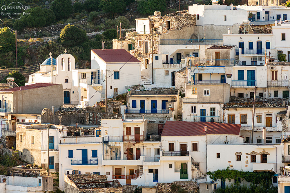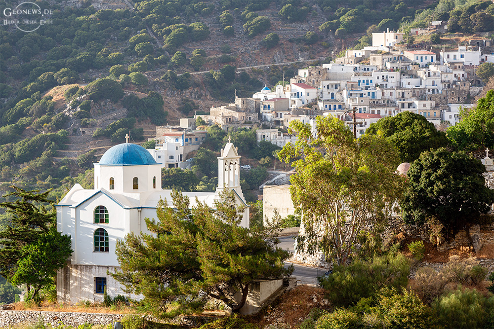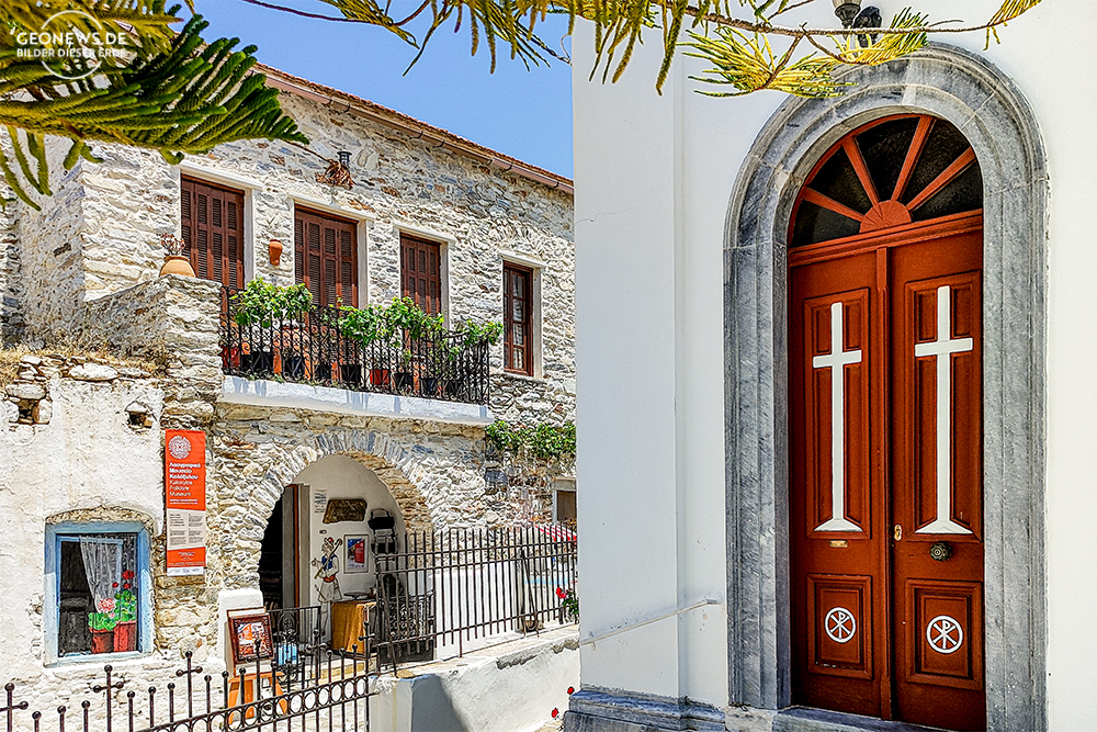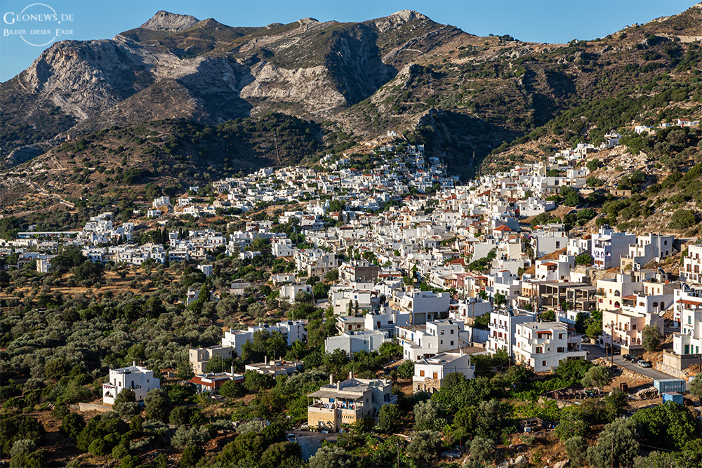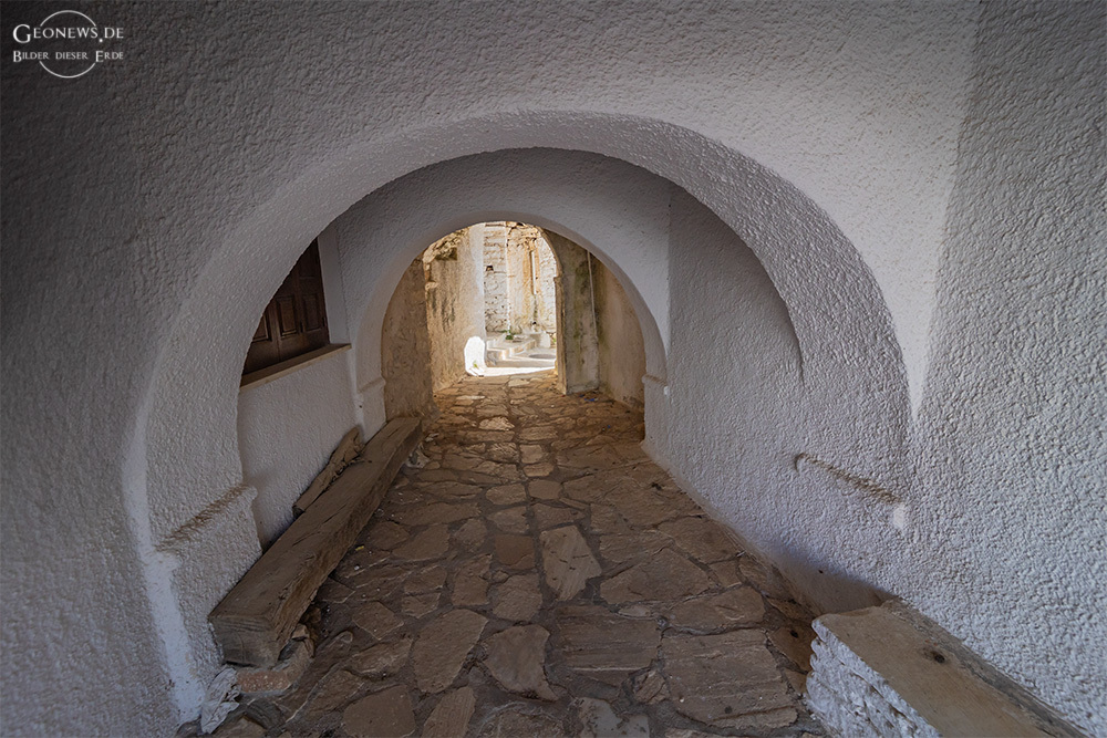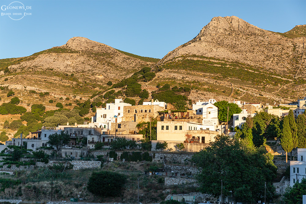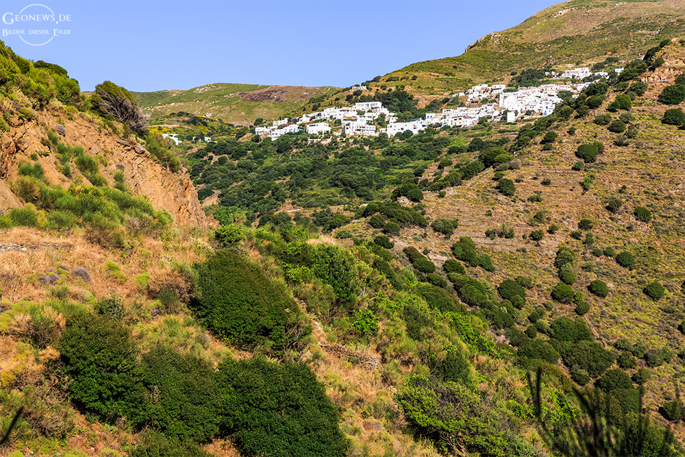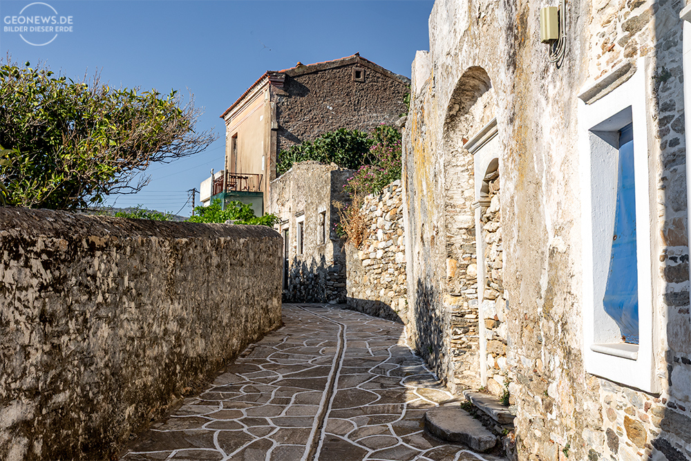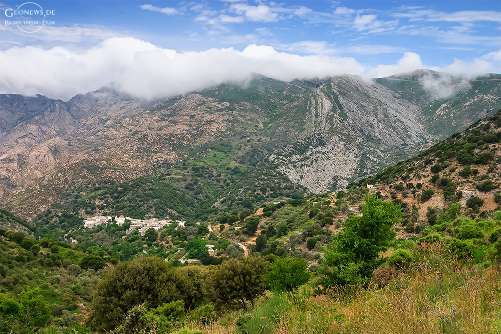 Apiranthos ist ein hoch in den Bergen gelegenes Dorf. Es ist liegt ca. 30 km von der Inselhauptstadt Chora entfernt und auf einer Höhe von ca. 600 m über Meeresniveau. Anders als bei den Dörfern in den Tiefebenen von Naxos herrscht hier keine weiße, kubische Bauweise vor. Die alten Häuser sind hier eher aus Bruchsteinen gebaut und dann weiß angestrichen. Natürlich hat auch Apiranthos einen Wohnturm, den Pyrgos Zevgoli. Weiter gibt es in Apiranthos drei kleiner Museen. Ein erstes Museumzeigt eine gute Übersicht von der Geologie von Naxos mit den typischen Gesteinen und einigen Fossilien. Im Archäologische Museum wird eine Vielzahl von Objekten aus der Stein- und Bronzezeit ausgestellt. Im Folkore Museum erfährt man schließlich dann etwas über die Lebensweise der Bewohner in den Bergdörfern.