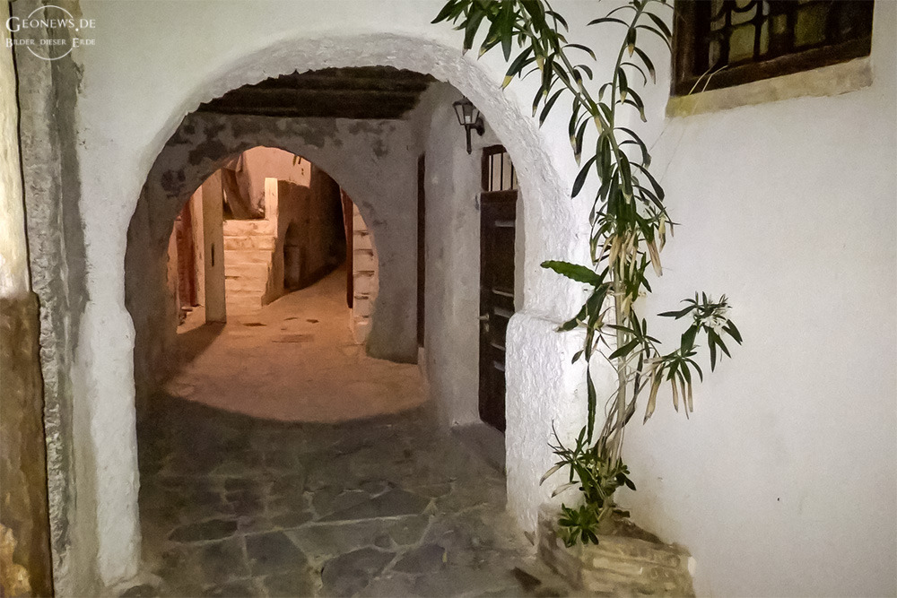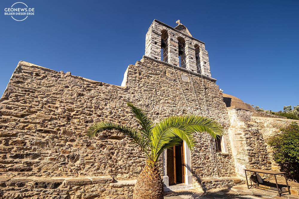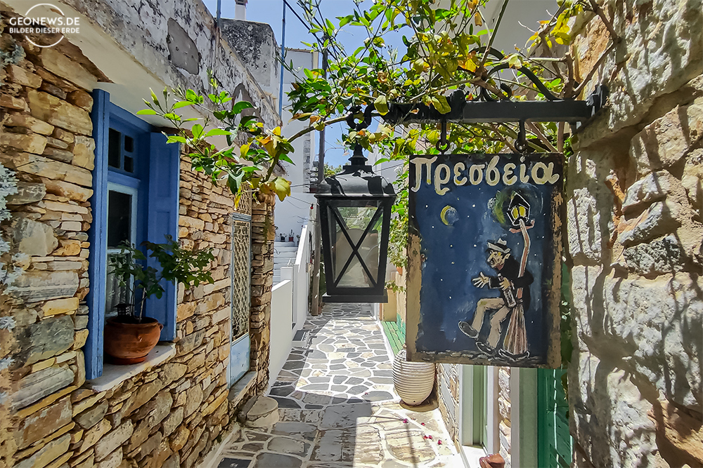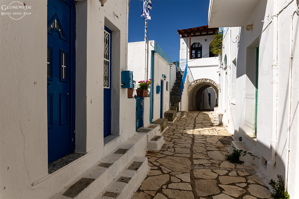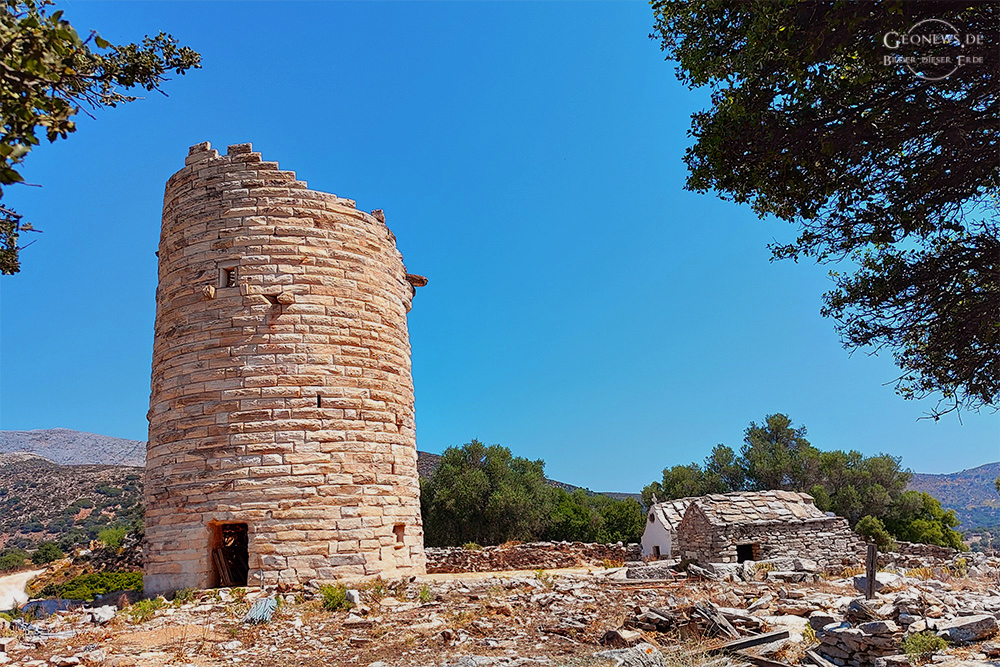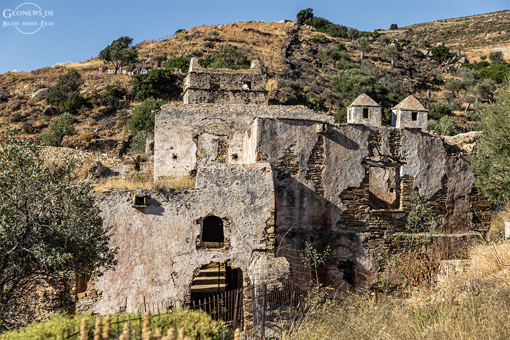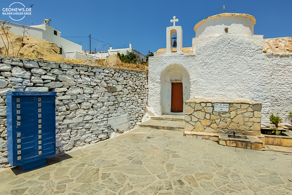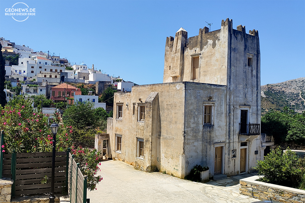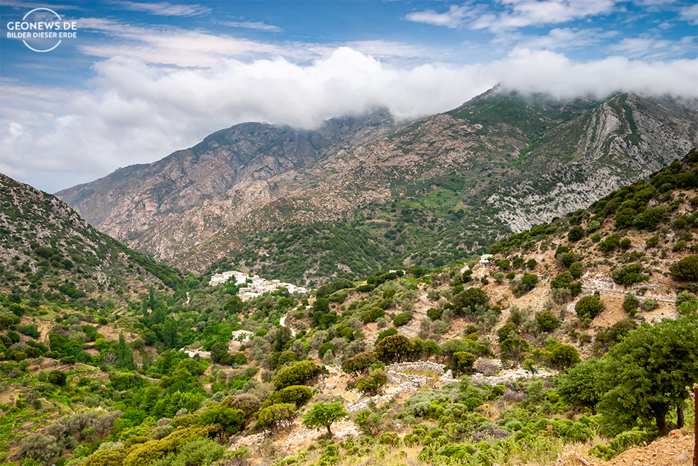 Apiranthos ist ein hoch in den Bergen gelegenes Dorf. Es ist liegt ca. 30 km von der Inselhauptstadt Chora entfernt und auf einer Höhe von ca. 600 m über Meeresniveau. Anders als bei den Dörfern in den Tiefebenen von Naxos herrscht hier keine weiße, kubische Bauweise vor. Die alten Häuser sind hier eher aus Bruchsteinen gebaut und dann weiß angestrichen. Natürlich hat auch Apiranthos einen Wohnturm, den Pyrgos Zevgoli. Weiter gibt es in Apiranthos drei kleiner Museen. Ein erstes Museumzeigt eine gute Übersicht von der Geologie von Naxos mit den typischen Gesteinen und einigen Fossilien. Im Archäologische Museum wird eine Vielzahl von Objekten aus der Stein- und Bronzezeit ausgestellt. Im Folkore Museum erfährt man schließlich dann etwas über die Lebensweise der Bewohner in den Bergdörfern.