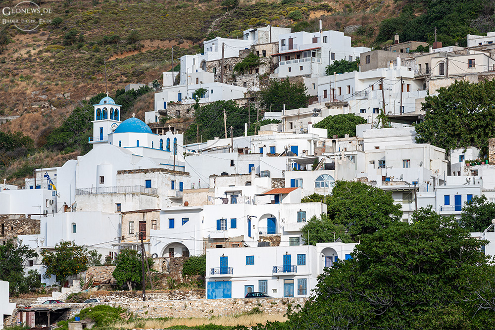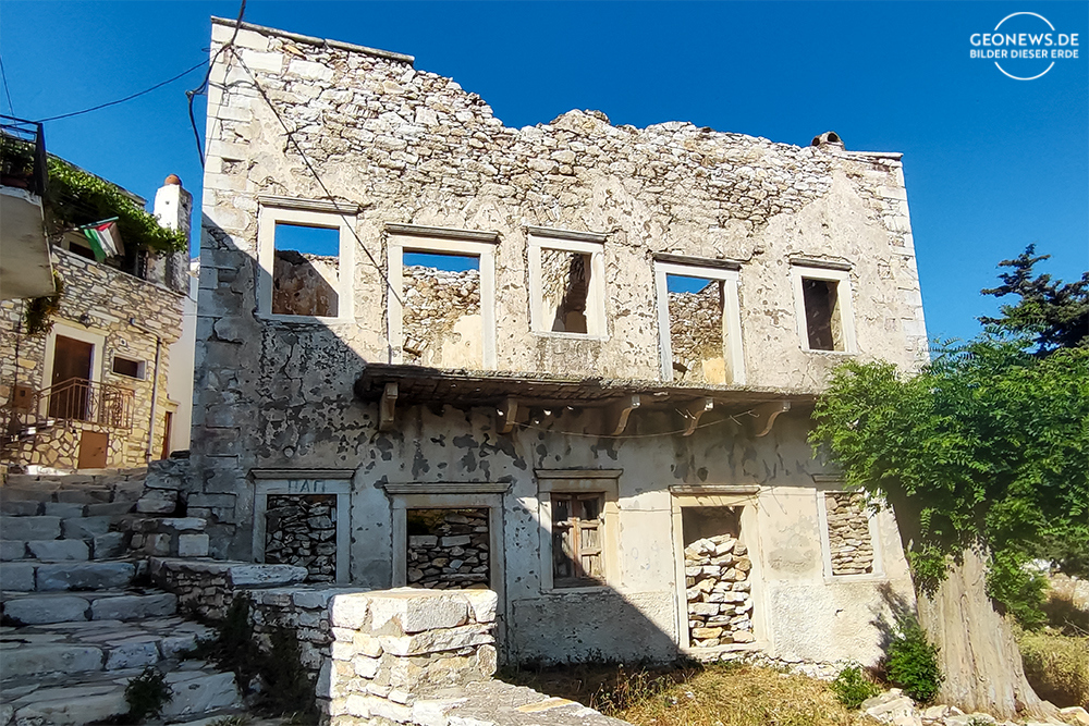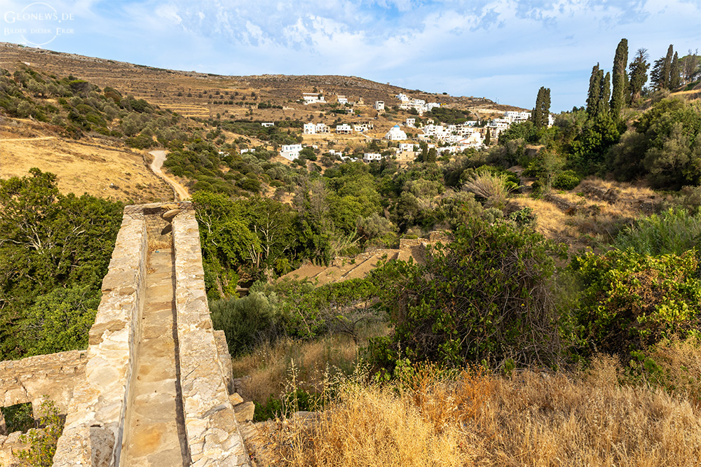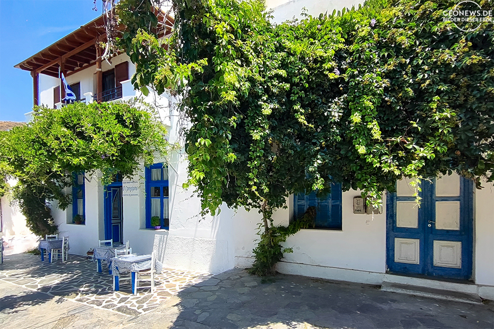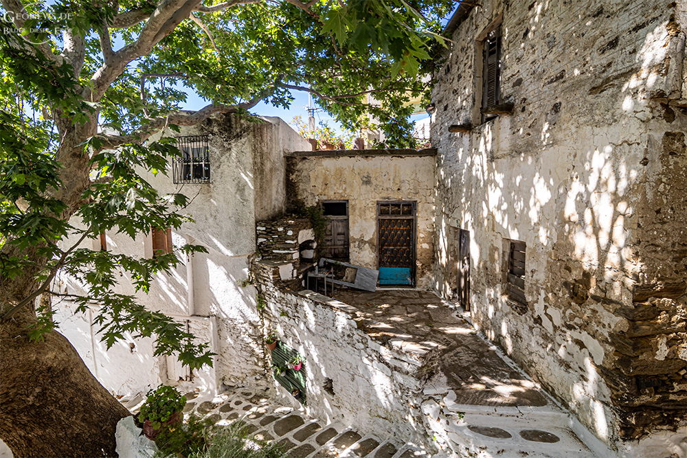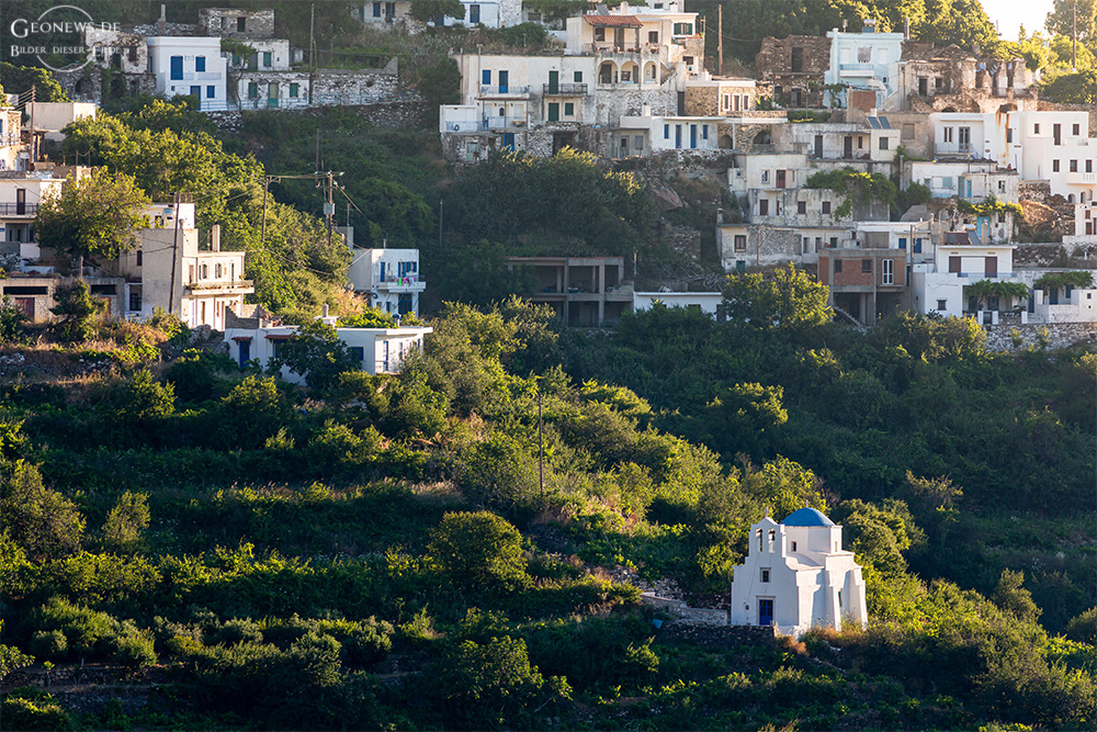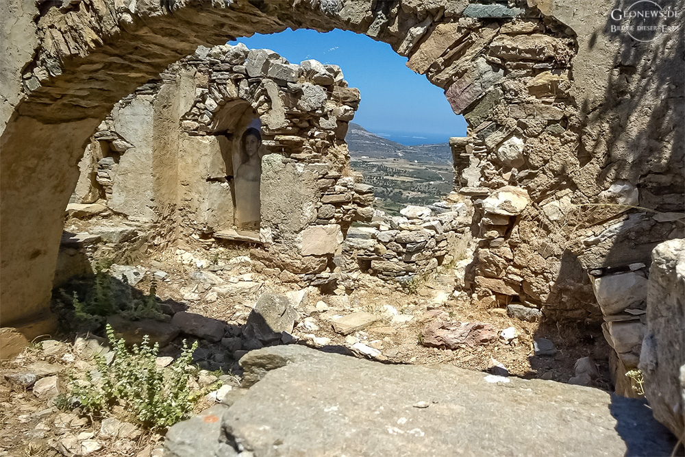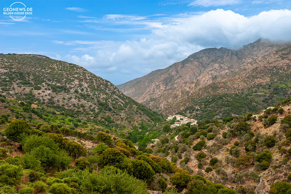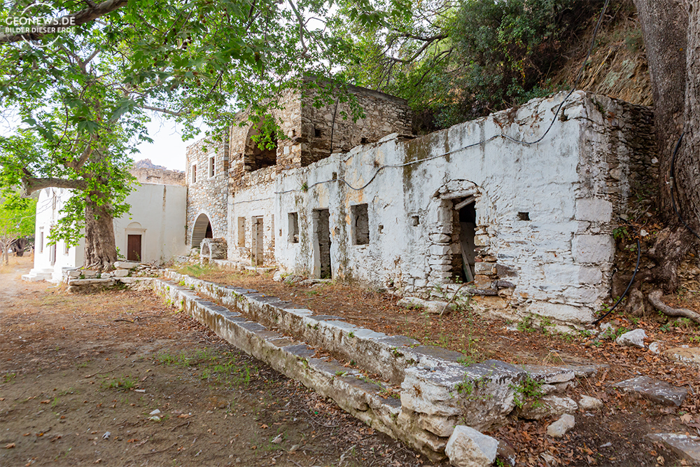 Apiranthos ist ein hoch in den Bergen gelegenes Dorf. Es ist liegt ca. 30 km von der Inselhauptstadt Chora entfernt und auf einer Höhe von ca. 600 m über Meeresniveau. Anders als bei den Dörfern in den Tiefebenen von Naxos herrscht hier keine weiße, kubische Bauweise vor. Die alten Häuser sind hier eher aus Bruchsteinen gebaut und dann weiß angestrichen. Natürlich hat auch Apiranthos einen Wohnturm, den Pyrgos Zevgoli. Weiter gibt es in Apiranthos drei kleiner Museen. Ein erstes Museumzeigt eine gute Übersicht von der Geologie von Naxos mit den typischen Gesteinen und einigen Fossilien. Im Archäologische Museum wird eine Vielzahl von Objekten aus der Stein- und Bronzezeit ausgestellt. Im Folkore Museum erfährt man schließlich dann etwas über die Lebensweise der Bewohner in den Bergdörfern.