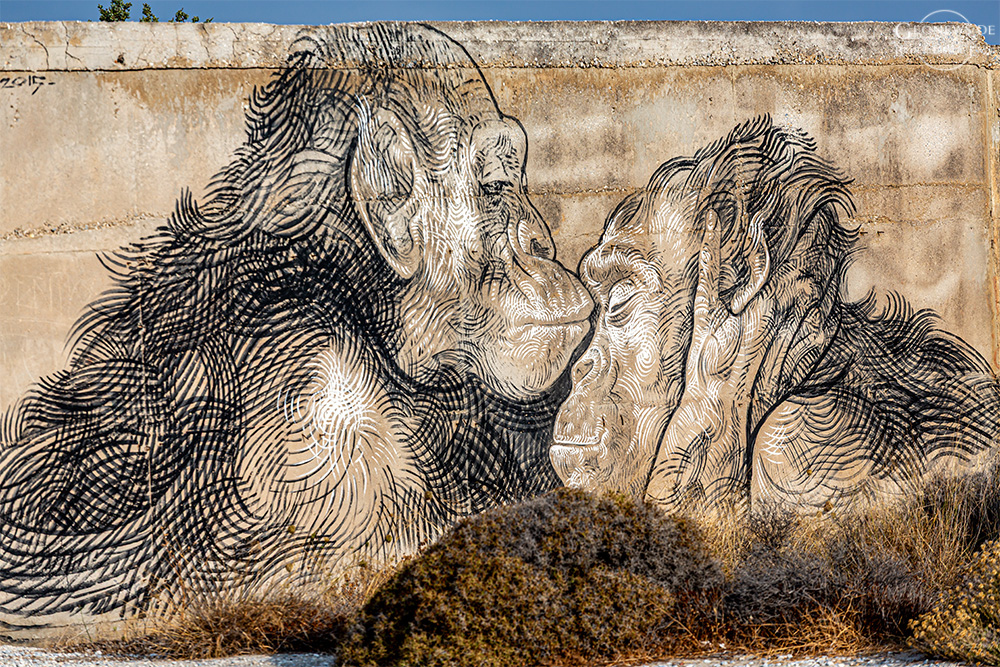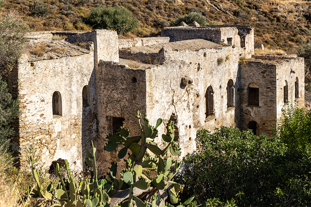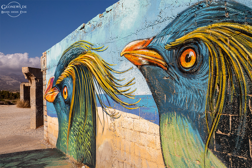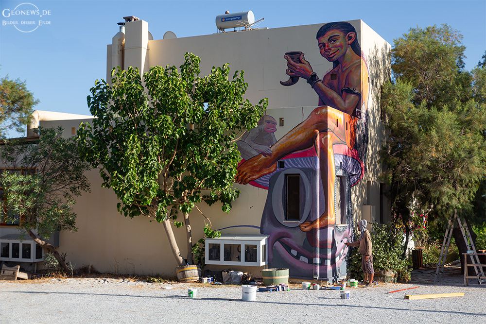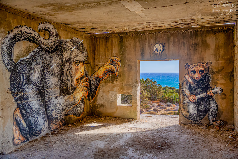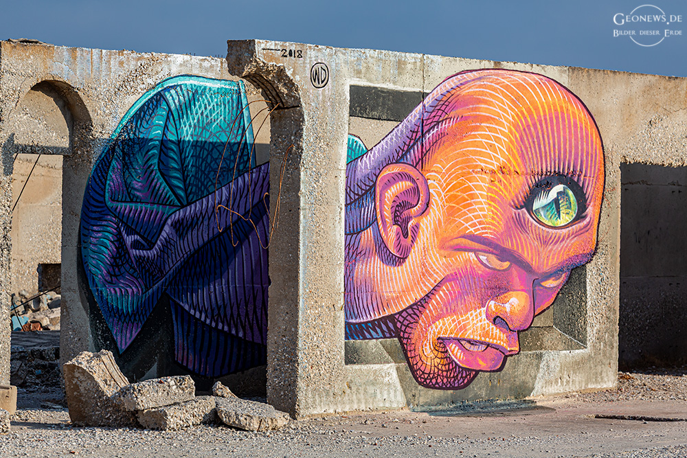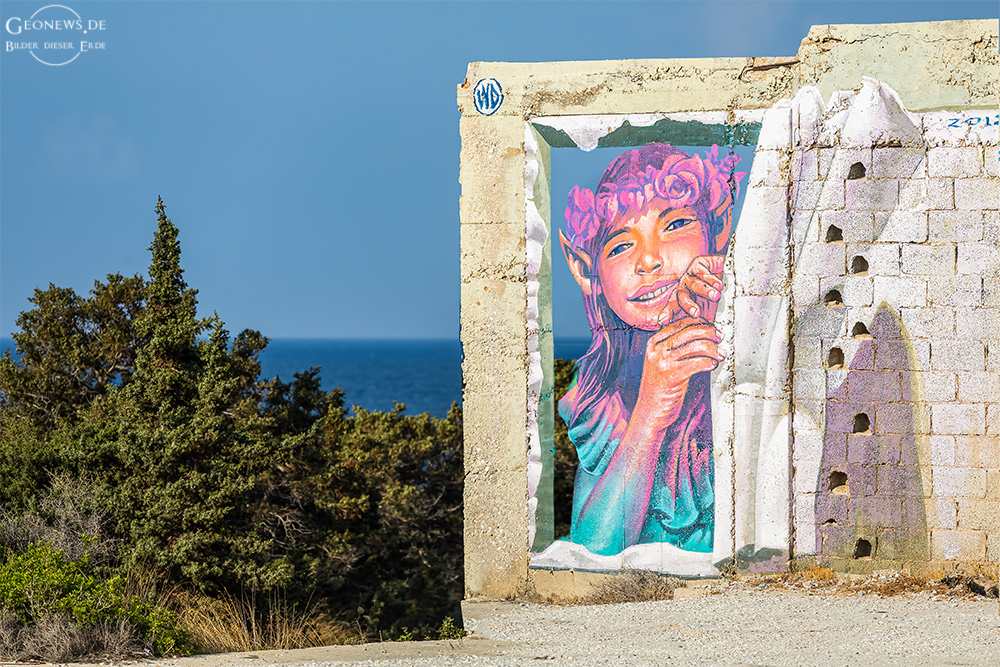 Sonnenschirmε und Liegestühle wird man dort vergeblich suchen, so dass selbst in der Hochsaison der Ruhesuchende ein stilles Plätzchen am Strand finden wird. An der Spitze des Cap Alykό befindet sich eine alte Hotelruine aus den siebziger Jahren des letzten Jahrhunderts. Der als Schwarzbau begonnen Hotelkomplex wurde aber niemals vollendet, da diese die naxiotischen Behörden gestoppt haben. Reste des Hotels bilden mittlerweilem eine pitureske Freiluftgalerie. Wild Drawing (WD) ein indonesischen Streetart Künstler, auch unter seinem griechischen Namen Skitsofrenis bekannt, begann ab dem Jahr 2018 die an sich tristen Ruinen, vor allem farblich besser in Szene zu setzen und erschuf innerhalb weniger Wochen eine VIlelzahl von Graffitis.