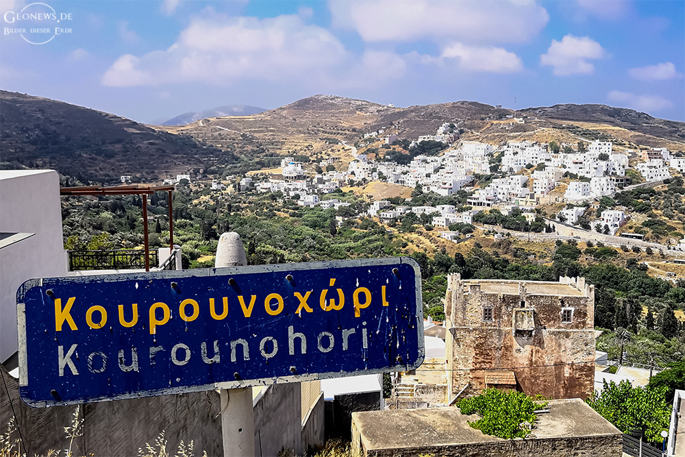 Kourounochori ist ein kleines Dorf, das ca. 10 km von der Chora entfernt oberhalb eines wasserreichen und somit fruchtbaren Tales anderen Seite des fruchtbaren Tales liegt nur unweit entfernt die Ortschaft Melanes. Aufgrund des Reichtums an Wasser wurden von den Einwohnern eine Vielzahl von Terrassen angelegt und bepflanzt. Größte Sehenswürdigkeit in Kourounochori ist der Pyrgos Della Rocca, auch bekannt als Pyrgos Frangopoulos. Der dreistöckige Pyrgos ist wohl einer der ältesten Wehrtürme der Insel und stammt aus dem 14. Jahrhundert. Weiter gibt es in dem Dorf ein archäologisches Museum. Das im Jahr 2010 eröffnet Museum beherbergt eine Vielzahl von Marmorskulpturen, Fliesen und Töpferwaren aus verschiedenen historischen Phasen. Weiterhin kann man sich dort über die antike Wasserleitung von Flerio in die Chora informieren.