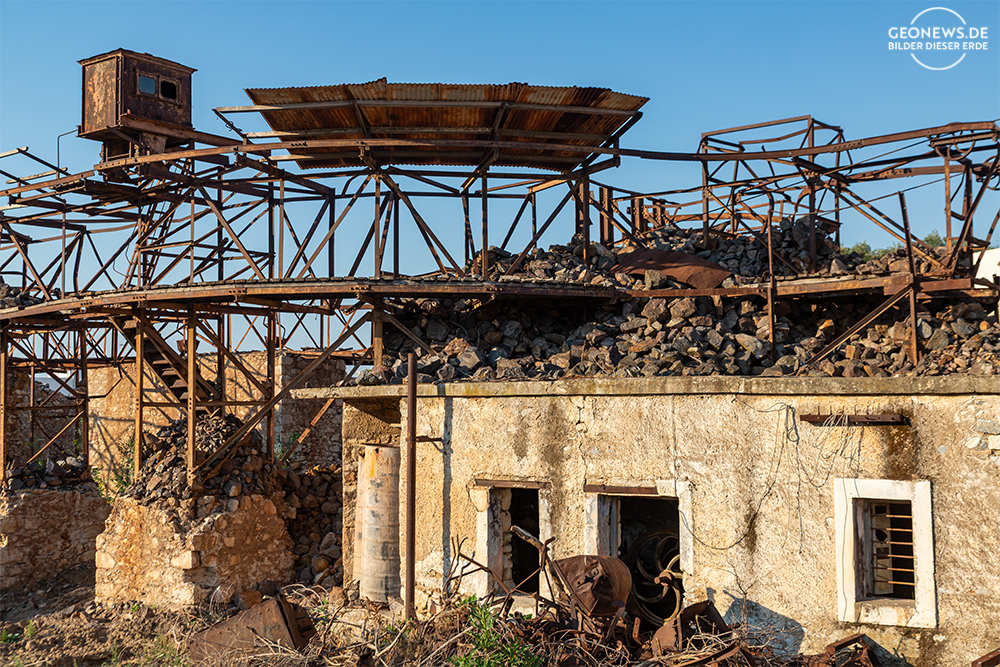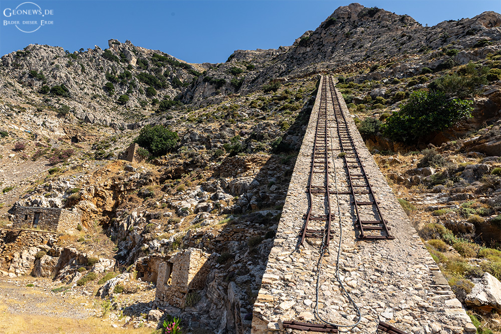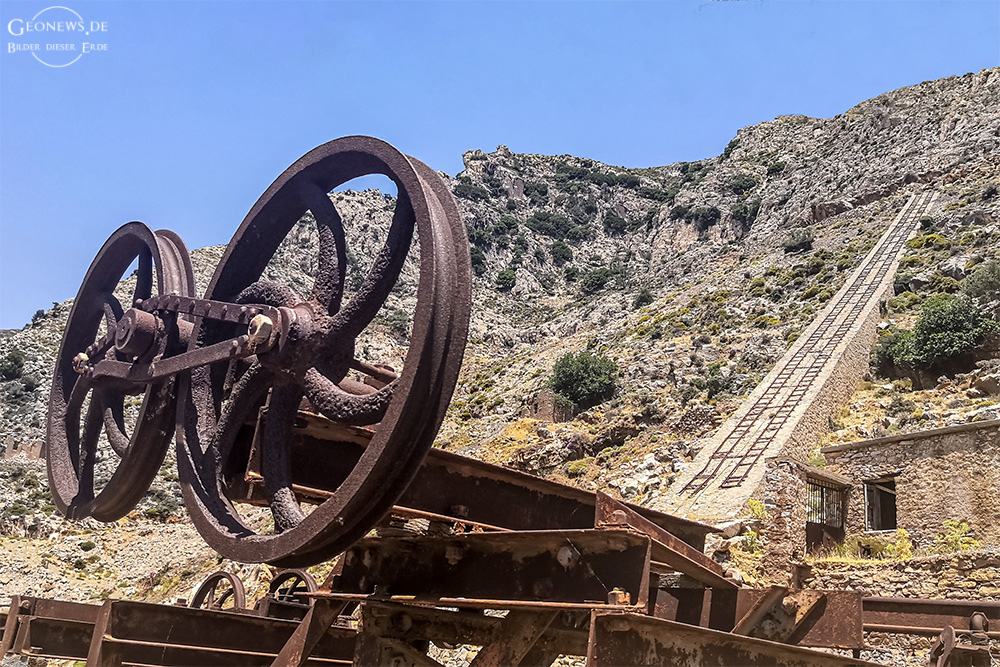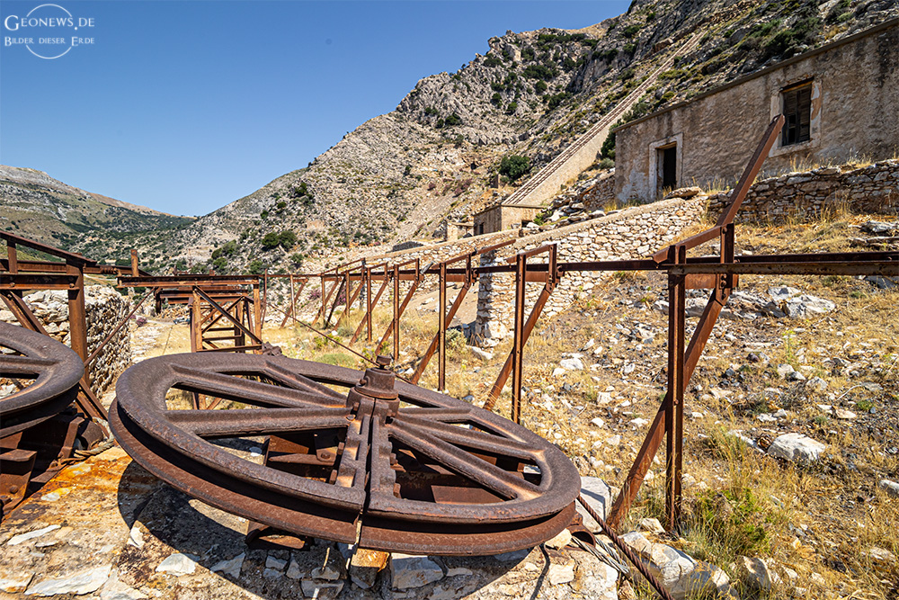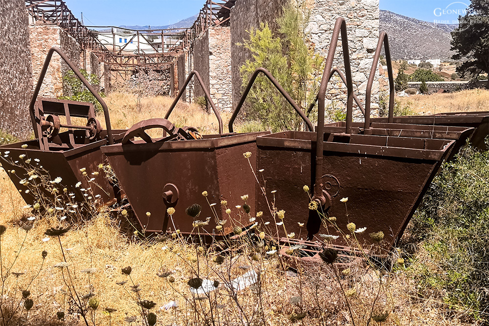 Der bergmännische Schmirgelabbau erfolgte dabei in den Bergregionen oberhalb von Moutsoύna im Bereich der Dörfer Koronos und Apiranthos. Von dort aus wurde der Rohstoff über Materialseilbahnen zu den Umladestation im Häfen von Moutsouna und auch Lionas verbracht. Naxioten betrieben den Abbau und Verwendung von Schmirgel wohl schon seit der Bronzezeit. Schmirgel ist dabei ein feinkörnigen Mineralgemisch mit den Hauptkomponenten Korund, mit Magnetit, Hämatit und Quarz. Nur noch Diamant übertriff dabei mit enem Härtgrad von 10 das Mineral Korunud. Die Bewohner von Naxos erkannten sehr schnell, dass man durch das äußerst harte Gestein andere weichere Materialien und Gesteine, wie zum Beispiel Marmor, sehr gut bearbeiten und formen lassen. Auch war der naxiotische Schmirgel ein gefragtes Exportgut. Schmirgel wurde dabei auch in weiter entfernten Regionen, wie z. B. sogar nach Ägypten, exportiert.